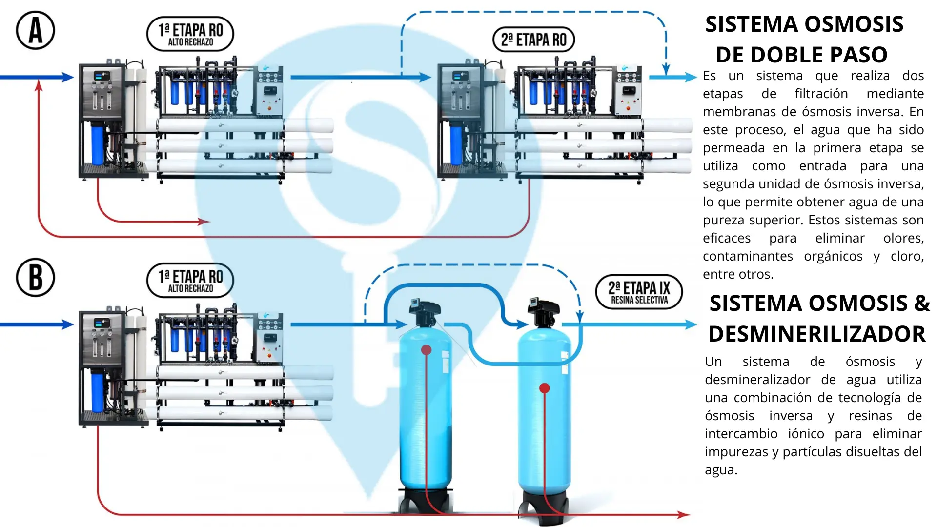 - Todos los sistemas de osmosis de doble paso de la serie RO- D/OSM requieren de un pretratamiento y/o postratamiento adecuado dependiendo de la procedencia y calidad del agua a tratar así como de la aplicación final del agua tratada.